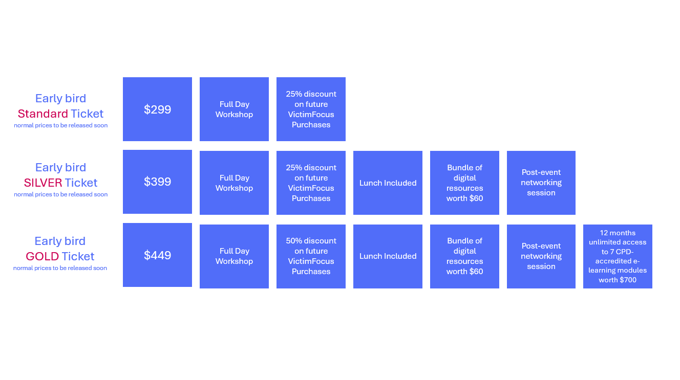 Concession rates available for students, low/no income, and those who work in the not-for-profit sector of $199AUD. Email Jaimi@victimfocus.org.uk for your discount code.